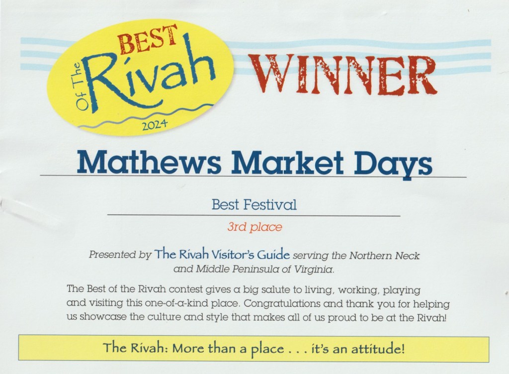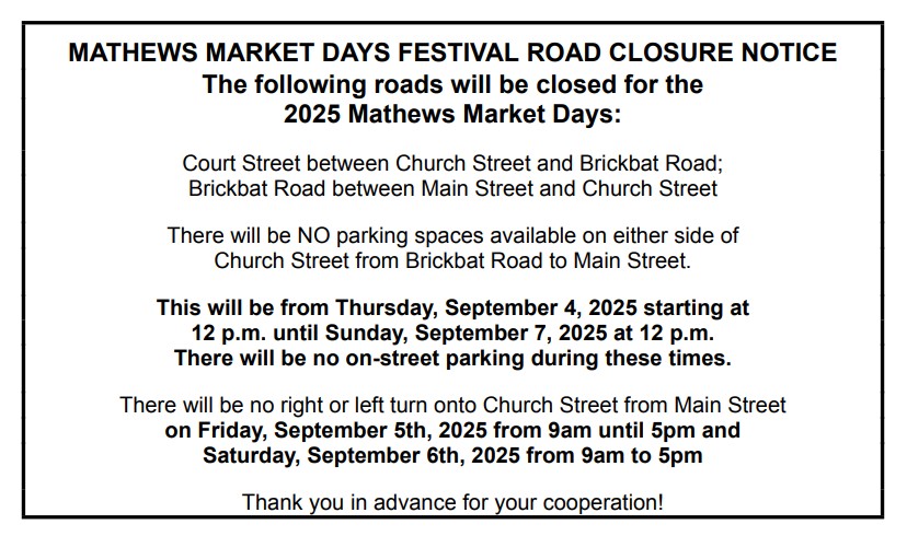 Mathews Market Days Inc. is a federally recognized 501(c)(3) charity. To make a tax deducible donation please follow the link below or please email us and ask about our other sponsorship opportunities at mathewsmarketdays@gmail.com! Click Here to Donate!